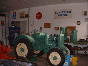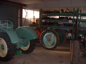 Auf etlichen Quadratmetern bietet das Schwungrad Platz für alte und restaurierte Traktoren, eine kleine Werkstatt und einen Aufenthaltsraum mit Waschgelegenheit.